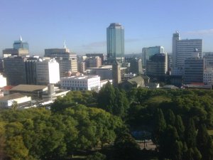 I am here as part of an IMF technical assistance team to the Finance Ministry and central bank specifically authorized by the IMF’s Executive Board to begin the IMF’s re engagement with Zimbabwe. Zimbabwe is a resource rich country and Harare is a beautiful city. (Top picture: Skyline with Reserve Bank of Zimbabwe prominently in the center. Second picture:  Me, Finance Minister Biti, and Ken Sullivan at a “casual Sunday” morning meeting)  I am impressed with the intelligence and skills of its professional class. What has happened in this country in recent years is a huge and shocking tragedy.